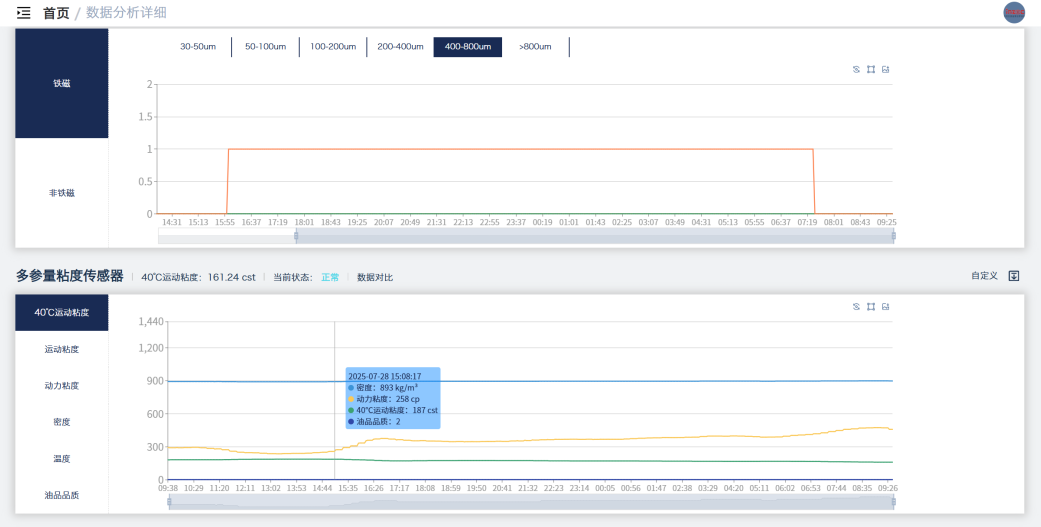 ■ 監測指標:支持40℃運動粘度、動力粘度、油品飽和度、PPM 含水量、鐵磁/非鐵磁磨粒、污染度、壓力、、流量、振動等指標的實時采集;